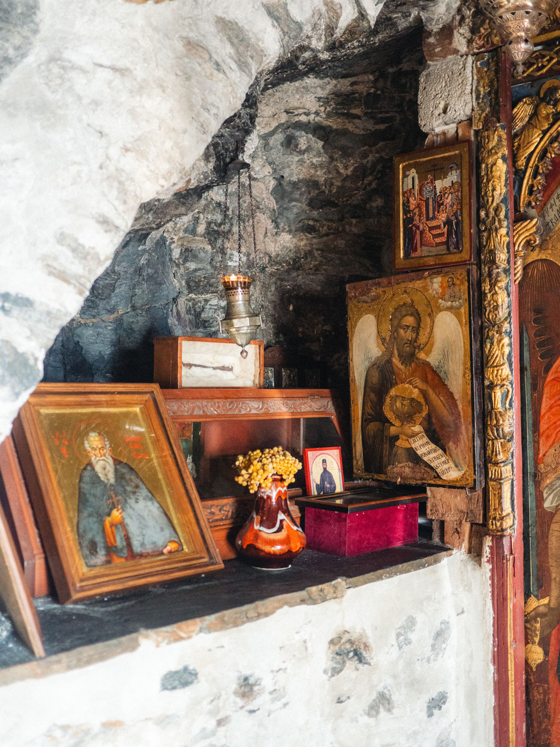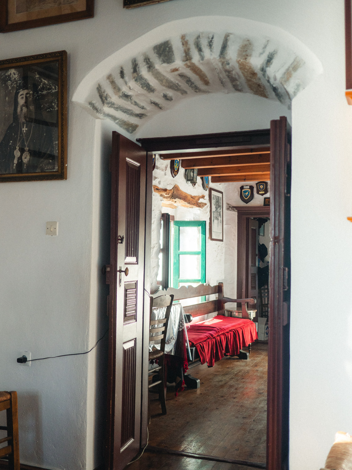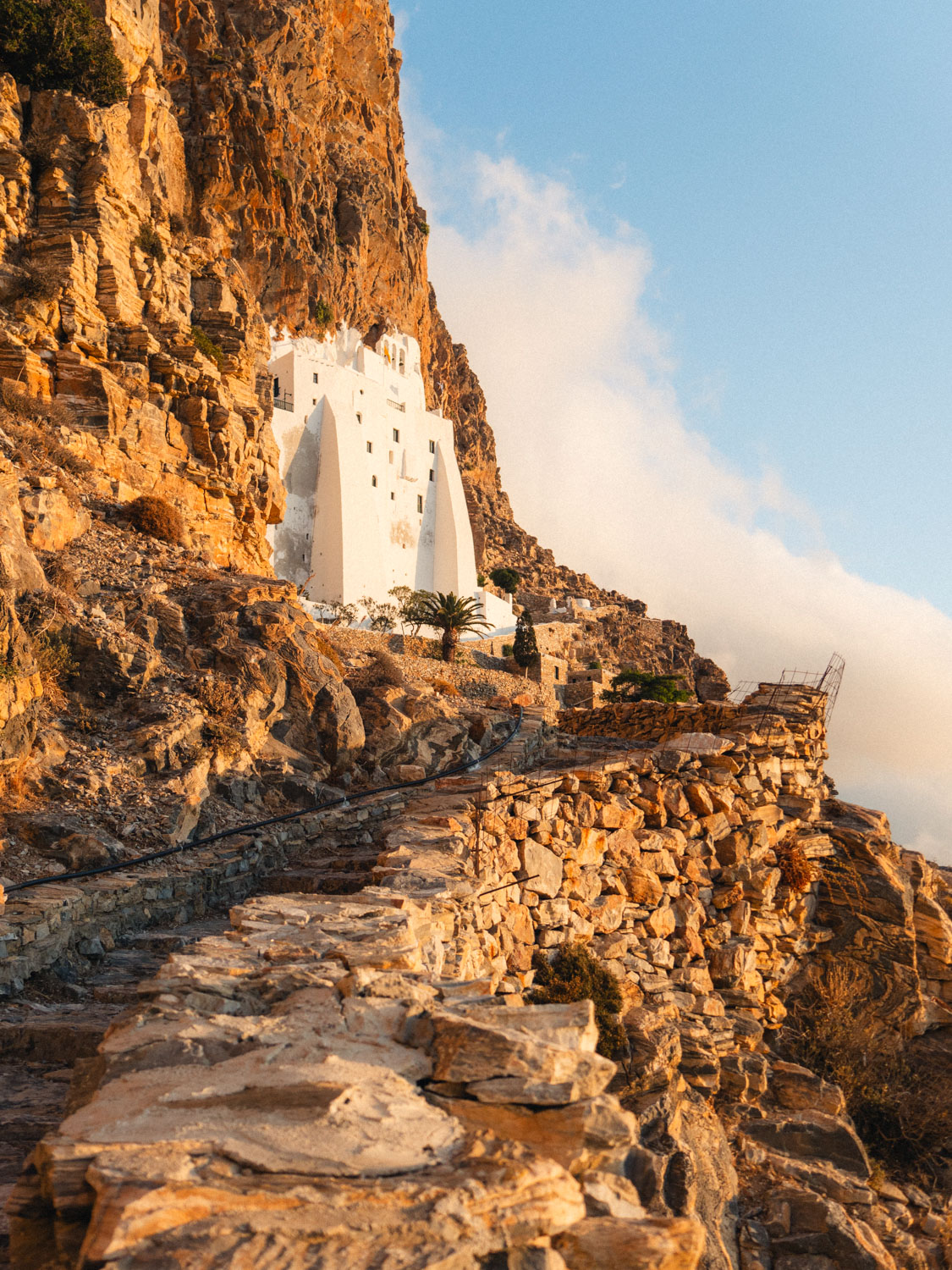 The absolute highlight of the island; is the 11th century Holy Monastery of the Virgin Mary Chozoviotissa. This monastery was carved out of a cliff (and originally not whitewashed) so it was perfectly camouflaged against the pirates. Make sure to dress modestly when visiting and be prepared to walk up quite some stairs to get to the entrance. It is the highlight of the island and during summer months it can get really busy here, mid-October and early in the morning there were no lines, however. Once in the monastery, you’ll be greeted by a volunteer who’ll tell you all about the history of the place and of the island as well. The area by the monastery is also great for watching the sunrise 😉.